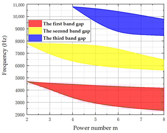 Evident from Figure 14, with the increasing power number, the frequency bands of the three bandgaps begin to narrow down. This is because the increase in power number results in a reduction in structural stiffness, thus reducing the resonant frequency. Hence, band gaps with lower frequency and wider bandwidth can be obtained by increasing the power number of the symmetric power-exponent prismatic phononic crystal. It is worth mentioning that the band gap starts to appear only when the power number m is greater than 2, because the energy-focusing effect is triggered when this condition is satisfied [33].