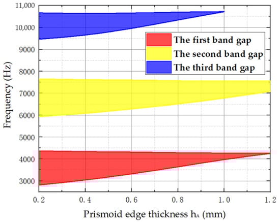 From Figure 15, as the edge thickness hA increases, the frequency bands of all the band gaps gradually narrow down, and the starting frequency of the band gaps begins to increase. When hA = 1.2 mm, the first band gap disappears. This is because the energy-focusing effect weakens as the edge thickness increases, which in turn leads to the weakening of local resonance effect [31]. Hence, band gaps with a lower starting frequency and wider bandwidth can be obtained by reducing the prismoid edge thickness.