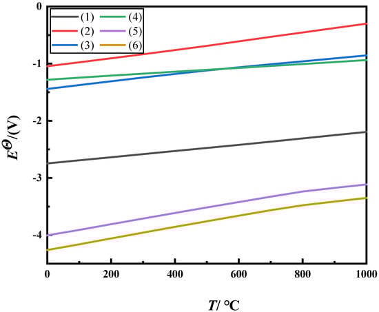 where, ΔGΘ is the standard Gibbs free energy, (kJ·mol−1); EΘ is the theoretical decomposition voltage in the standard state, (V); F is the Faraday constant, (96,485 C·mol−1); and n is the number of electrons gained or lost in the reaction equation.