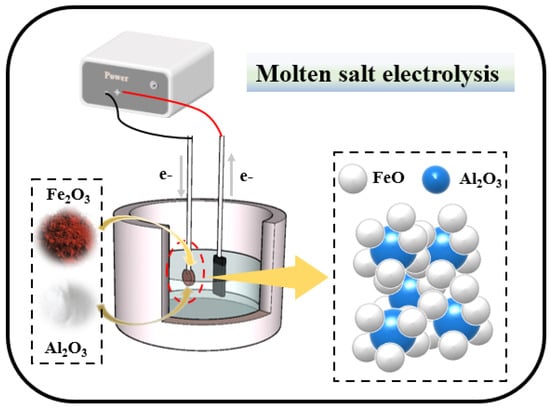 The cathode raw materials were analytically pure (99.5%) Fe2O3 and Al2O3 powders (Macklin Group Co., Ltd., China, analytical reagent). Fe2O3 and Al2O3 with a mass ratio of 3:2 was weighed, the two powders were mixed evenly, place into an agate ball milling tank, an agate ball and 6 mL alcohol were added, and then the ball was milled for 6 h to achieve a small and uniform particle size. The powder dried for 12 h and was poured into the sample pressing mold, pressed on the sample pressing machine with a pressure of 6 MPa for 3 min, and then removed. The pellets were sintered for 5 h at 800 °C to ensure they had a certain strength and density. The sintered pellet was the cathode of electrolysis (10 × 3 × 1 mm3). High-purity graphite pellet (100 × 15 × 5 mm3) was used as the electrolytic anode. Weighed NaCl and KCl with a molar ratio of 1:1 was mixed well, and poured into a graphite crucible (the total mass of NaCl and KCl was 180 g). The graphite crucible was placed into the tubular furnace, the furnace temperature was raised to the experimental temperature under argon atmosphere and maintained for 1 h to completely melt the molten salt. Then, the assembled cathode and anode were placed into molten salt, and a voltage of 2.3 V for 4 h was applied. The whole process was carried out in argon atmosphere to prevent the electrolytic device and sample from being oxidized. Argon atmosphere can also prevent oxygen in the air from dissolving into molten salt. After electrolysis, the cathode was rinsed with distilled water in argon atmosphere to remove the salt adhered to its surface, then the cathode pellet was placed into a beaker and 50 mL of alcohol was added, washed in an ultrasonic cleaner for 10 h, and then dried. The schematic diagram of the electrolysis process is shown in Figure 2. The prepared samples were characterized using a D/MAX2500PC diffractometer and Zeiss Gemini 300 electron microscope, and the phase differences and microstructure differences caused by different electrolysis temperatures were analyzed.