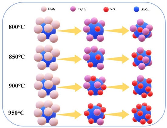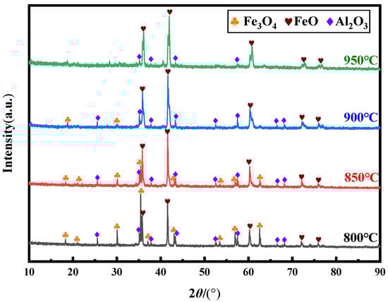Figure 3 shows the XRD pattern of the product after electrolysis at 2.3 V at different temperatures for 4 h. The products of the cathode pellet at 800 °C were Fe3O4, FeO and Al2O3 phases, of which Fe3O4 was the main phase. This shows that the transformation degree of Fe3O4→FeO was not considerable at this temperature, and there was still a considerable amount of Fe3O4 in the sample. When the electrolysis temperature was low, the viscosity of molten salt electrolyte was high, the fluidity was poor, the conductivity was also low, and the kinetic conditions of O2− transmission were relatively worse. According to the thermodynamic calculation in Section 2.1, it can be found that with the decrease in temperature, the theoretical potential of the reduction reaction of iron oxide increases. Therefore, under the condition of constant voltage, the reaction at lower temperature had less over potential, and the electrolysis rate was slower, which affected the diffusion of O2− from the cathode to molten salt. The Fe3O4 content of the cathode product at 850 °C decreased sharply, and the FeO content increased and became the main phase in the sample. After electrolysis at 900 °C, the main product of the cathode was still FeO, the FeO peak was stronger, and the content of Fe3O4 decreased gradually. The main product of electrolysis at 950 °C was FeO. Fe3O4 basically disappeared. Because at a high temperature the theoretical electrolytic voltage of iron oxide was low, the over potential of the reaction was larger and the reaction faster. At the same time, it can also be clearly found in the experiment that the viscosity of electrolyte decreased, so the resistance of ion movement was smaller and the movement speed faster, which weakened the concentration polarization and was conducive to the progress of the reaction, making it quickly convert to FeO under the specified conditions. Some researchers found the same phenomenon by electrochemical means. The increase in temperature will reduce the activation energy of the iron oxide electro deoxidation reaction, which will increase the reaction rate [21].
