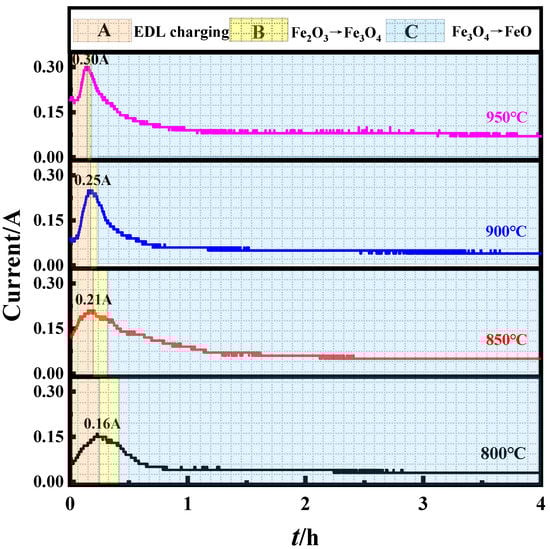 Figure 4 shows the recorded I-t curve corresponding to different electrolysis temperatures. The curve can be divided into three stages of A, B and C. Stage A is the electric double layer charging process. After the power is turned on, the electrode will complete the polarization charging in a short time, and the current will rise to the maximum value quickly. When the current reaches the maximum value, it means that the electric double layer charging is completed. At this time, the three-phase boundary is formed, and subsequent electric deoxidation can be carried out. Stage B is the process of electro deoxidation of Fe2O3 to Fe3O4, which represents the gradual entry of molten salt into the cathode pellet and the formation of a new three-phase boundary constantly advancing towards the interior of the pellet at the deoxidized Fe3O4 and undeoxidized Fe2O3. At this stage, with the transition from Fe2O3 to Fe3O4, the current gradually decreased and tended to be stable. The current entered a short plateau period, and Fe2O3 was completely deoxidized to Fe3O4. Stage C represents the process of electro deoxidation of Fe3O4 to FeO, and the current in this stage is smaller than that in stage B. As the reaction occurred inside the cathode pellet, the three-phase boundary was also deeper, which led to the resistance of the pellet becoming larger, so the overpotential provided by the power supply was smaller, the driving force of the reaction was smaller, and the current further dropped [22]. Combined with the duration and current of stages B and C, it was more difficult for Fe3O4 to transform into FeO than Fe2O3 to Fe3O4. As the rate curve in electrochemical reaction, the slope of I-t curve in each stage can reflect the reaction speed in this stage to a certain extent, and can be used to compare the reaction kinetics under different conditions. Table 1 shows the absolute value of the current slope obtained by the linear fitting of A and B stages. The fitting was carried out using Origin 2021. Comparing the I-t curves at different temperatures, when the electrolysis temperatures were different, its initial currents were different, and the slope of current change with time was also different. The higher the temperature was, the higher the electric double-layer charging speed and current peak after charging were. The shorter time required for stage B, the better kinetic conditions of the reaction. XRD and I-t curves both show that the electrolysis temperature had a significant effect on the electrolysis reaction rate. As the temperature of molten salt decreases, the theoretical decomposition voltage required for raw oxide will increase. If the voltage is constant, the driving force of the electrolytic reaction will decrease at this time, which is bound to affect the reaction rate dynamically. On the other hand, a higher electrolysis temperature can shorten the time required to complete stage A and B, so in the case of limited time, the time left for stage C will be longer, and the amount of FeO obtained by deoxidation will be greater.