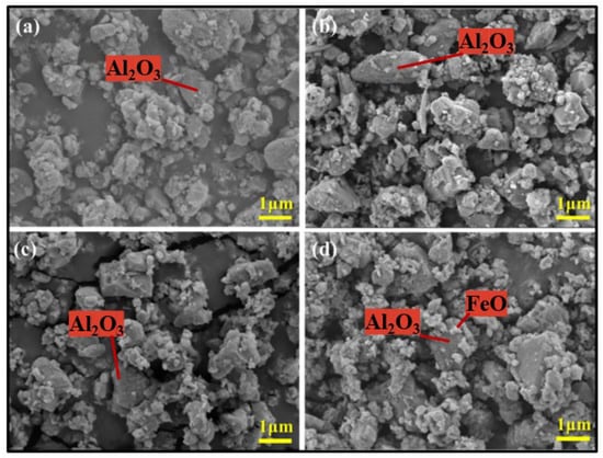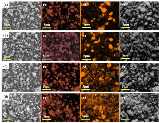 Figure 5 and Figure 6 show the SEM and energy spectrum surface scan images of the samples after electrolysis for 4 h at different temperatures. The large block particles were Al2O3, and the small particles were the products of Fe2O3 deoxidization, which adhere to Al2O3 particles to form nuclei and mature. With the increase in the electrolysis temperature, the particles of deoxidized Fe2O3 become increasingly smaller. According to the XRD results, this phenomenon was due to the increasing amounts of FeO obtained by deoxidation. The electrolysis temperature of 950 °C was suitable for this experiment.