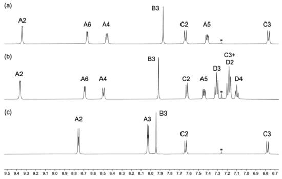 The aromatic regions in the 1H NMR spectra of (a) 1, (b) 2, and (c) 3 (500 MHz, 298 K, CDCl3). * = residual CHCl3. Scale: δ/ppm. Atom labelling is defined in Scheme 2.