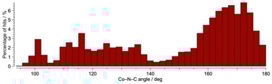 Distribution of Co–NNCS–CNCS bond angles in compounds containing N-bonded thiocyanate ligands coordinated to cobalt(II) found in the CSD (version 2022.1.0).