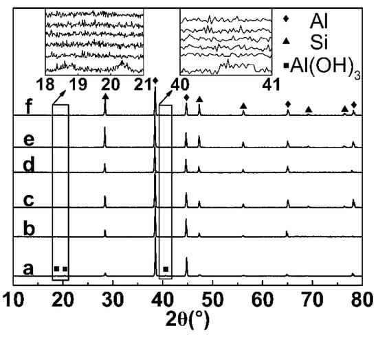 Al-Si powder, with different amounts of Si, exhibits different morphologies [,,]. The eutectic Si can be observed when the Si content in Al-Si powder is close to 12.6 at. %. Eutectic Si and primary Si coexist in Al-Si powder when the Si content is higher than 12.6 at. %. Meanwhile, the primary Si became more irregular and larger with the increase in Si content. These studies demonstrated that AlOOH nucleated at the Si substrate; however, the influence of Si morphology on the nucleation of hydrated alumina has been neglected in these studies.