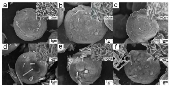 Figure 3 presents the SEM images of A27 prepared using different methods and times. The thickness of the nanosheets prepared by the water bath method was thinner than those of the hydrothermal method. As shown in Figure 4a–c, the thickness of the nanosheets also increased with the increase in the reaction time. Moreover, the same conclusion can be obtained from Figure 4d–f. The growth of the nanosheets on the surface of Al-Si@Al(OH)3(W) was abnormal, and abundant impurities appeared around the core–shell structure, decreasing the active sites and compromising the catalytic performance. Compared with the water bath method, the hydrothermal method is a better way to prepare pure Al-Si@Al(OH)3. It is noteworthy that the increase in time only affected the thickness of the nanosheets, and we can decrease the hydrothermal time to obtain equally distributed core–shell structures, shortening the preparation cycle.