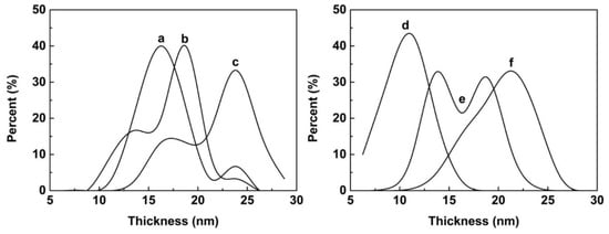 The thickness distribution of the Al(OH)3 nanosheets: (a) A27H3, (b) A27H6, (c) A27H9, (d) A27W3, (e) A27W6, and (f) A27W9.