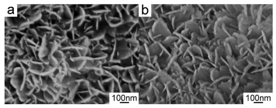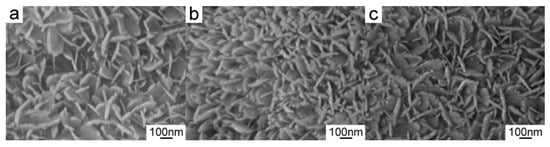 In order to reveal the growth mechanism during the initial stage, the ground and polished Al-20Si alloy was treated with deionized water at 80 °C for 30 min, and morphological changes were observed, as shown in Figure 10. Overall, the distribution of nanoflakes was mainly focused on the interphase between the Si phase and the Al matrix, which indicates that the nucleation of Al(OH)3 mainly occurred at the Al/Si interphase, and the nanosheets completely covered the surface of the Al-Si particle with the increase in the reaction time. In addition, more nanosheets were observed on the surface of the eutectic Si than the primary Si phase, which indicates the influence of the Si area on the Al(OH)3 deposition.