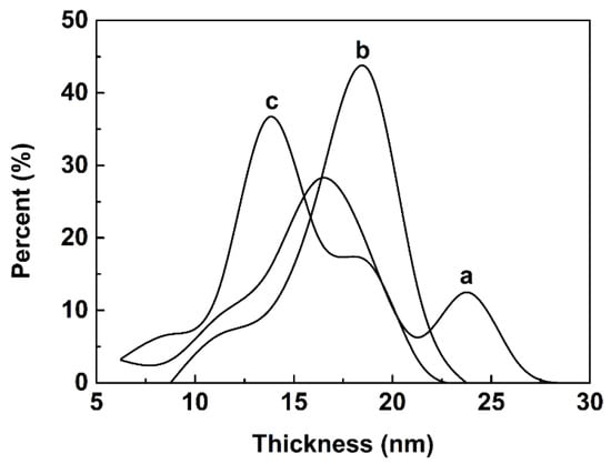 The thickness distribution of the Al(OH)3 nanosheets: (a) A17H6, (b) A27H6, and (c) A37H6.
