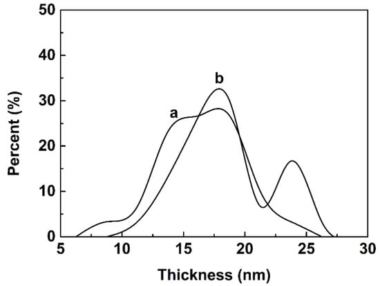Thickness distribution of the Al(OH)3 nanosheets: (a) A23H6 and (b) A27H6.