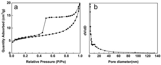 To further investigate the influence of the Al-Si particle size, two different grain sizes were utilized to form Al-20Si@Al(OH)3(H). It is observed that there was a small distinction in the morphology and thickness distribution of the nanoflakes, as shown in Figure 7a,b and Figure 8a,b. As the particle size of the Al-Si powder influenced the Si morphology, the density of the primary Si on the surface of the Al-Si particles increased with the decrease in the mean particle size. It can be concluded that the particle size renders a negligible influence on the structure of the Al(OH)3 nanoflakes. Figure 9a presents the adsorption/desorption isotherms of A27H6, which belonged to type-Ⅳ of IUPAC and indicated the presence of mesopores. The specific surface area was found to be 19.5573 m²/g, which indicates that the nanoflakes increased the specific surface area of the Al-Si particles. The pore diameter of A27H6 was mainly distributed below 25 nm, as shown in Figure 9b.