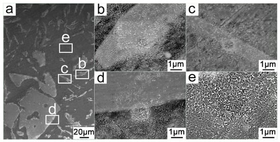 The morphology of the Al-20Si@Al(OH)3(W): (a) Al-20Si, (b,c) eutectic silicon, (d) primary silicon, and (e) aluminum.