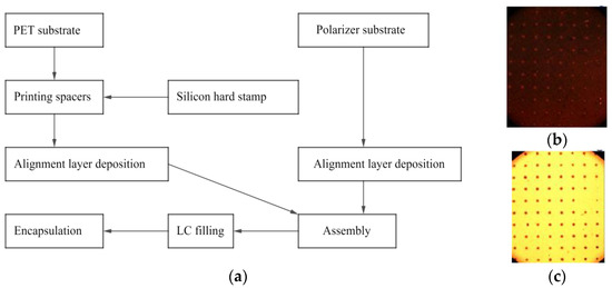 In order to obtain constant layer thickness, it is necessary to distribute the spacers on plastic substrate. The corresponding stamping process includes the following steps: the printing roller covers the surface with printing ink, then curing with ultraviolet radiation under heating is applied to the substrate results in photopolymerization of the material. The heating produces strong adhesion of the spacer to the substrate. As the result, adhesive surface layer of the spacer does not cause any leak or contamination of the liquid crystal. At the next stage, the photoalignment layer (sulfonic azo dye, SD1) needs to be spin coated on the substrate with the spacers on the same side. Another plastic substrate with a polarizer on the reverse side is coated with the alignment layer, e.g., HPL008 (DIC, Tokyo (Tokyo, Japan)), which is not photosensitive. After creating the initial alignment direction on the first substrate and setting the alignment direction on the second substrate, the surfaces are assembled together and bonded with epoxy to seal the LC cell. Clamping silicone stamp creates a gap on the plastic substrate with a height of about 10 μm. Using UV light to cure the epoxy, the spacers will be solid. The flowchart of the described process is shown in Figure 2a.