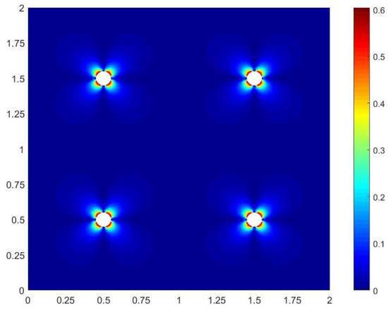 Following the proposed geometry (Figure 1a), let the director have tangential alignment on the surfaces of spacers. Then, one can consider a sufficiently large area with relatively small spacer of radius of 0.05 in the center (0.5; 0.5), which deforms the director field. Having defined the equation of the circle, we can calculate its derivative for the top and down arcs. Assuming that and , one can plot the solution of Equation (5). Without loss of generality, we assume that the azimuthal angle distribution is periodic along the (x; y) plane with the unit period. Then the resulting model distribution takes the form, which is depicted in Figure 3.