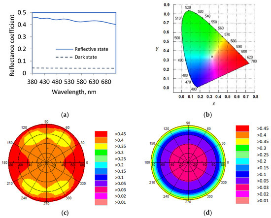 The investigation of viewing angle dependence was also carried out by exploiting the features of quasimonochromatic light propagation in layered systems. This method allows treatment with equal ease coherent and incoherent interactions between the fractions of light propagating in the layered system. We then calculate the viewing angle dependences for reflective and dark states of ORW e-paper. Solutions presented below were found by means of MOUSE-LCD as well (see Figure 4c,d). Parameters of the problem are summarized in Table 1. Spectral data for complex refractive index of aluminum were used for the metal reflector. Calculation of the reflectance coefficients shows that it is symmetric with respect to the angle of observation (see Figure 4c,d).
