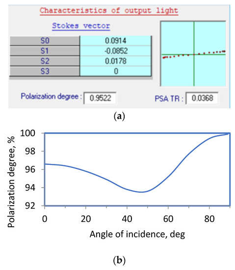 (a) Typical MOUSE LCD window with the output light characteristics; (b) dependence of the polarization degree versus the angle of incidence.