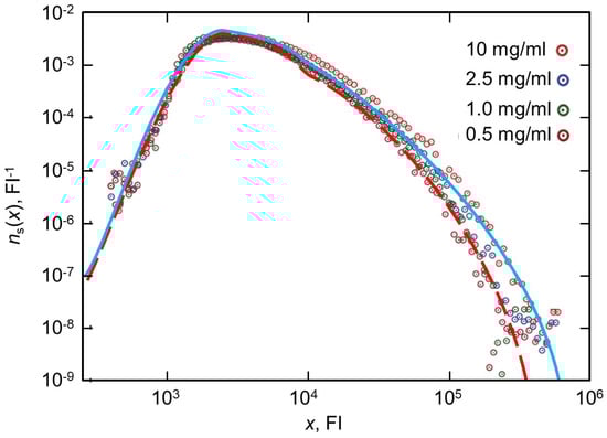 Theory (expression (22)) is compared with experimental distribution (Figure 3E in Ref. [10]) after 45 min internalization of low-density lipoprotein (LDL) for four different LDL concentrations: s; s, FI; FI s (blue solid line) and FI s (red dashed line).