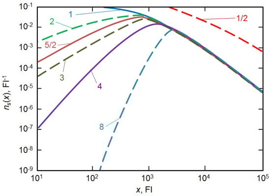 A short summary of exact steady-state solutions to Equation (7) is given in Table 1. Based on the data listed in this table, we compare the steady-state distribution functions (the third column of Table 1) in Figure 2. As is easily seen, the steepness of the curves for small x grows as the parameter increases.