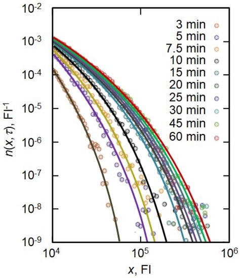 where is a typical amount of particle volume in newly appearing agglomerates, and is constant. We consider such an exponentially decaying source function (6) because of its importance for intracellular nanoparticle transport [24]. Note that the case with the source described by a gamma function was analysed numerically [10]. It was shown that the exact form of the injection function does not affect the shape of the distribution for large x.