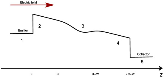 is the gamma function, and is the confluent hypergeometric function. Lastly, , , and ; are the amplitudes of the running waves, indicating the incident wave and reflected wave, respectively [15,28]. In Regions 1 and 5, the amplitude of a plane wave traveling in the positive or negative z-direction is assumed to be [29]; , , and are the effective mass of the QW, effective mass of the quantum barrier, and QW potential, respectively.