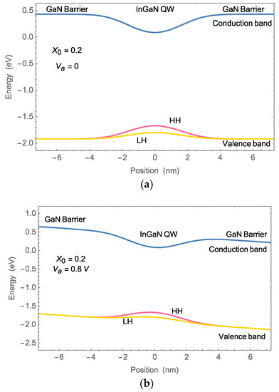 In Figure 3 and Figure 4, the barrier height was fixed at (0.344, 0.51, and 0.67 eV) in the conduction band, (0.25, 0.4, and 0.47 eV) in the valence band for HH, and (0.12, 0.17, and 0.22 eV) for LH at (), respectively; the InGaN quantum well width was 3 nm, and the GaN barrier width was 1 nm, and 12 nm, both of which remained fixed in the absence of applied voltage. The strain increased along with the mole fraction. As a result of the increased strain, the conduction and HH bands were pushed upward in the same direction, which led to a decrease in the energy gap. Accordingly, the energy gap values decreased (1.76, 1.6, and 1.4 eV) with the increase in , respectively.
