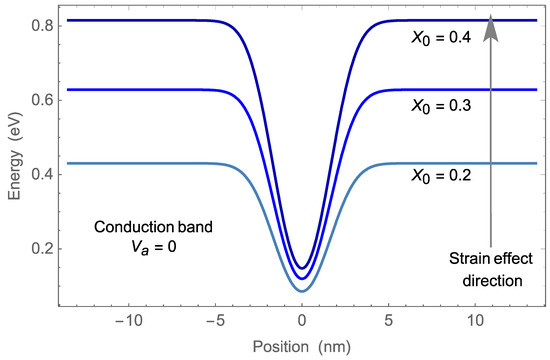 Strain effect direction for conduction band of the InxGa1-xN/GaN parabolic LED structures with various mole fractions at an applied bias of 0 V.