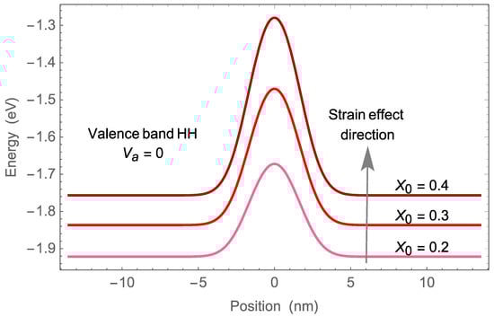Strain effect direction for valence band (HH) of the InxGa1-xN/GaN parabolic LED structures with various mole fractions at an applied bias of 0 V.
