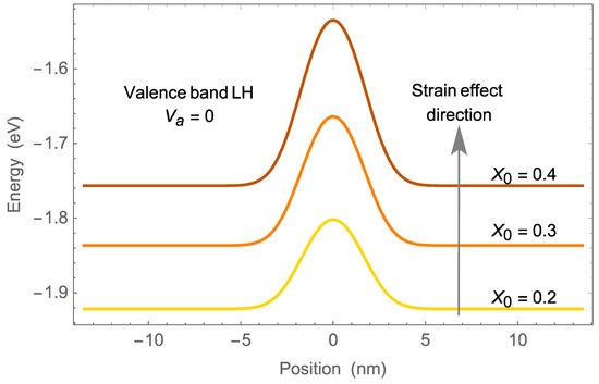 Strain effect direction for valence band (LH) of the InxGa1-xN/GaN parabolic LED structures with various mole fractions at an applied bias of 0 V.