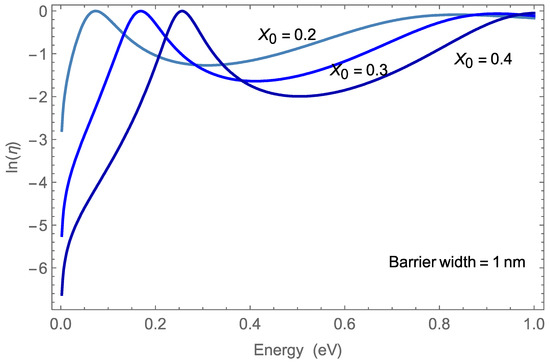 Figure 6 and Figure 7 show the logarithm of the transmission coefficient for the electrons and HH as a function of energy for the double-barrier InxGa1−xN/GaN parabolic quantum well structure with a barrier width = 1 nm, for various values of . The calculation for the barrier height was as indicated in Figure 3, Figure 4 and Figure 5. The electric field extended across the structure at an applied bias of 0.8 V. The transmission coefficient of the electrons in Figure 6 shows single energy peaks at 0.071, 0.17, and 0.25 eV for various In Figure 7, the transmission coefficient of HH shows single energy peaks at 0.188, 0.079, and 0.221 eV for various It is clear that the energy of the electron transmission peak increases along with , whereas the energy of the transmission peak of HH fluctuates. The energies presented in Figure 6 and Figure 7 are in a bound state, as they have lower values than the barrier height for various values of The transmission coefficient of the electron is close to unity at for = 0.2 and 0.3, and at for = 0.4. Likewise, the transmission coefficient of HH only close to unity at for = 0.3 and 0.4, respectively. The tunneling probability of the electrons and HH incident from the GaN side of the InGaN/GaN interface can be determined from these energies . These observations indicate that with increasing , the transmission peak of electrons and HH shifted to higher energies, except at , in the case of the latter. Under an electric field, electrons and HH exhibit less oscillation and tend to be stable, due to the slope of the barrier height, which explains why only one peak is present.