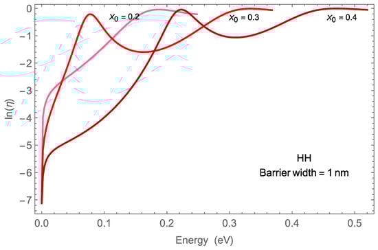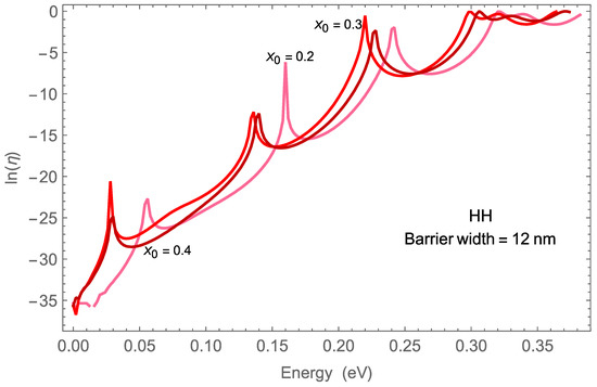 Logarithm of the transmission coefficient for HH as a function of energy for the double-barrier InxGa1−xN/GaN parabolic quantum well structure with various at an applied bias of 0.8 V, and barrier width 12 nm.