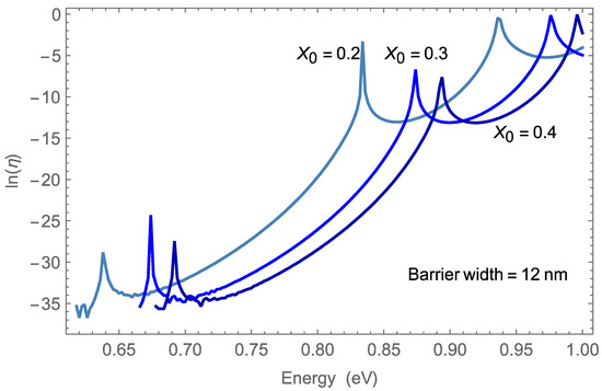 Logarithm of the transmission coefficient for electrons as a function of energy for the double-barrier InxGa1−xN/GaN parabolic quantum well structure with various at an applied bias of 0.8 V, and barrier width 12 nm.
