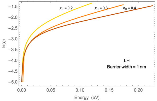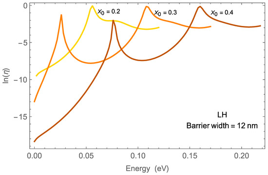 Logarithm of the transmission coefficient for LH as a function of energy for the double-barrier InxGa1−xN/GaN parabolic quantum well structure with various at an applied bias of 0.8 V, and barrier width 12 nm.