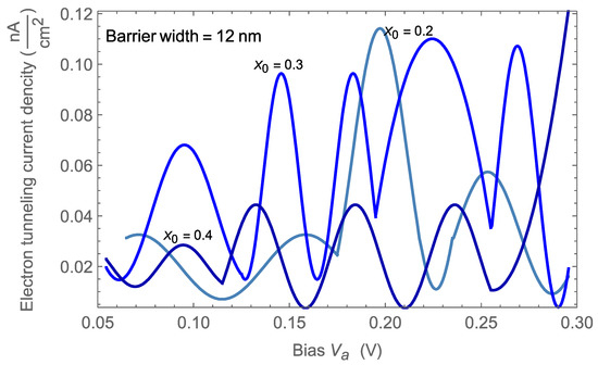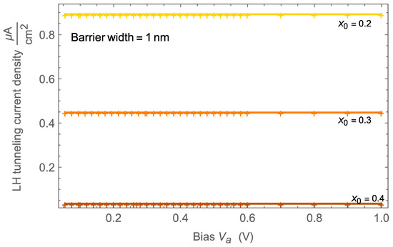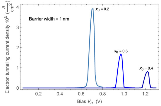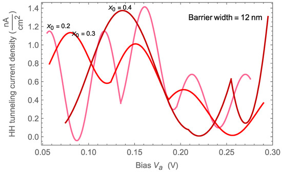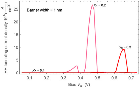 The relationships between the current density and applied voltages of 1 nm, and 12 nm for the barrier thickness for various values of , are illustrated in Figure 12, Figure 13, Figure 14, Figure 15, Figure 16 and Figure 17. The current density peaks that occurred under the conditions of an electric field that has been applied across the InGaN/GaN structure is evidence of electron resonant tunneling through the potential well [4,15,27]. A comparison between the electron tunneling current density and HH tunneling current density revealed that the current density peaks for electrons tended to occur at higher voltages with increased than for the HH at a barrier width of 1 nm. The electron tunneling current density is decreased with increased at a barrier width of 1 nm. The number of current density peaks increased for the electrons and HH at a barrier width of 12 nm. The electron tunneling current density is higher than HH and LH tunneling current density at a barrier width of 1 nm, while being less than both HH and LH at a barrier width of 12 nm. Additionally, the barrier width = 12 nm had a higher peak-to-valley ratio (PVR) than the barrier width = 1 nm; this indicates a series of NDRs, hence low power dissipation. The NDR property is critical in circuit implementation, because it can provide different voltage-controlled logic states for the peak and valley currents [4,35]. In Figure 16 and Figure 17 no peaks are observed, indicating the absence of NDRs. The LH tunneling current density decreased with increased.