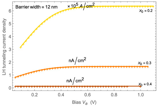 Current density-voltage characteristics of the LH tunneling at width barrier 12 nm.
