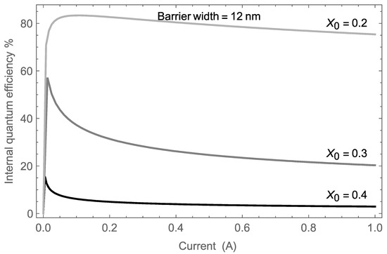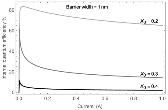 IQE curves as a function of current are plotted in Figure 18 and Figure 19, according to the ABC model in Equation (12). The current values were determined using Equation (11). The calculation shows that an increase in would effectively decrease the efficiency. The efficiency droop at a current of would be 3%, 14%, and 65% at a barrier width of 1 nm, and would be 4%, 20%, and 75% at a barrier width of 12 nm, with decreasing . The reason for this efficiency droop could be related to the increase in current and decrease in tunneling lifetime. A decrease in tunneling lifetime would reduce the escape speed of particles. That means the LED with the thicker quantum barriers has a smaller efficiency droop. Therefore, we obtained a slight amelioration with increased barrier width.