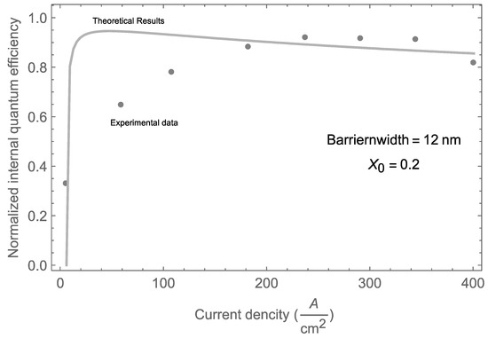 Normalized internal quantum efficiency as a function of current density obtained from the previous study [16], along with the theoretical results.