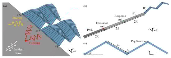 As shown in Figure 1a, the proposed tunable reflective elastic metasurface is composed of a series of zig-zag structures with different folding angles. Different folding angles lead to different flexural rigidities of the zig-zag structures and thus a desired phase shift can be achieved by folding the zig-zag structures to the prescribed angles. By tuning the folding angles, the reflective elastic metasurface can steer the reflected flexural waves in different directions and focus on the reflected flexural waves with different focal distances. We first study the reflection characteristics of the reflected flexural waves in the subunit when the zig-zag structures have different folding angles. The subunit of the tunable reflective elastic metasurface and the enlarged view of the zig-zag structures are shown in Figure 1b,c. To realize folding of the zig-zag structures, the adjacent panels are connected to each other by pegs/screws. Thus, one can change the folding angles easily while fixing the folding angles on demand by tightening the pegs/screws.
