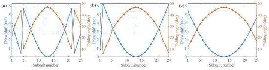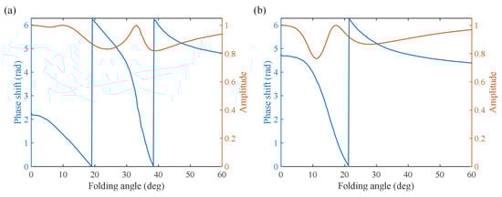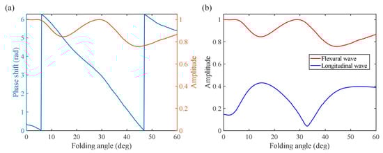 As shown in Figure 2a, the phase shift and amplitude of the reflected flexural waves in the subunit when the zig-zag structures have different folding angles are plotted. The range of the folding angle is between 0 and 60° and no mechanical interference will occur between the adjacent panels within this operation range. It is seen that the phase shift can cover a span, meaning that one can easily realize a phase gradient elastic metasurface by folding the simple zig-zag structures to different angles and the phase shift changes almost linearly with respect to the folding angle, which is beneficial to the design of elastic metasurfaces. However, unlike the previously published reflective elastic metasurfaces [], where the amplitude of the reflected wave is maintained at unity, the amplitude of the reflected flexural wave in our design is only unity at certain folding angles due to the coupling between the flexural wave and longitudinal wave caused by the asymmetry of the zig-zag structures []. To verify this, as shown in Figure 2b, the amplitude of the reflected longitudinal wave with respect to the folding angles is plotted. A lower amplitude of the reflected flexural wave corresponds to a higher amplitude of the reflected longitudinal wave, indicating that the reflected flexural wave at some folding angles is mitigated by the coupling between the flexural wave and the longitudinal one.
