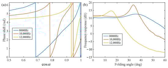 (a) The phase shift with respect to at the three frequencies obtained from the numerical simulations. (b) Frequency response with respect to the folding angle at the three frequencies obtained from the numerical simulations.