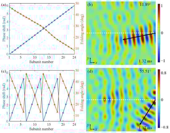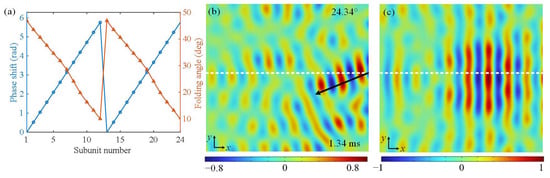 where is the reflection angle, is the incident angle, is the spatial phase shift gradient, n is the number of the subunit to cover a phase shift and is the width of the subunit. A vertical incident flexural wave impinging on the tunable reflective elastic metasurface () is considered. We first choose n as 12 and the corresponding phase shift distribution and folding angle distribution are shown in Figure 5a. The subunit number is numbered from small to large along the positive y-direction, as shown in Figure 1a. In this case, the theoretical reflection angle can be obtained as 24.34°. To verify the steering of reflected flexural waves in the plate, a time domain simulation is conducted in the COMSOL software. The flexural wave fields in terms of the out-of-plane displacements are plotted in Figure 5b. As a comparison, the flexural wave field on the plate without the zig-zag structures is also plotted in Figure 5c. Due to the presence of the metasurface, the direction of the reflected flexural waves has been changed and the reflection angle almost maintains as the theoretical one.
