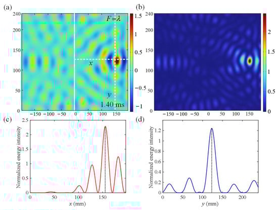 Numerical simulation results of (a) the reflected flexural wave field, (b) the normalized energy intensity field, and (c,d) the corresponding normalized energy intensity distribution along the white dashed line when the focal distance is .
