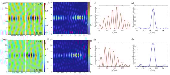 Numerical simulation results of (a) the reflected flexural wave field, (b) the normalized energy intensity field, and (c,d) the corresponding normalized energy intensity distribution along the white dashed line when the focal distance is . Numerical simulation results of (e) the reflected flexural wave field, (f) the normalized energy intensity field, and (g,h) the corresponding normalized energy intensity distribution along the white dashed line when the focal distance is .
