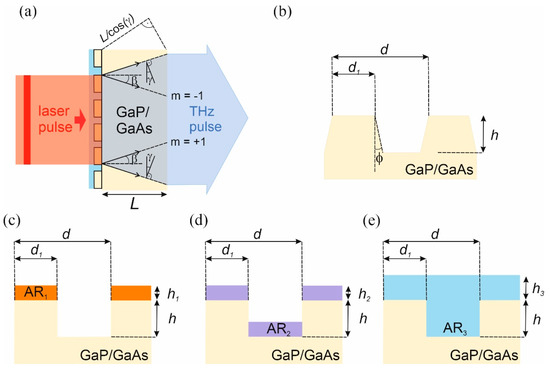 (a) Scheme of contact grating THz source. (b) Cross-section of a distorted grating profile indicating the -wall angle. (c–e) Rectangular profiles with antireflective (AR) coatings of , , and a Norland optical adhesive 170 (NOA), respectively. —grating period, —ridge width, —groove depth, —AR1 thickness, —AR2 thickness, —AR3 thickness, —refractive index of GaP/GaAs, and L—crystal length.