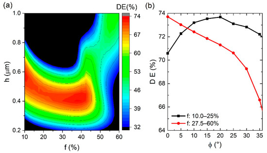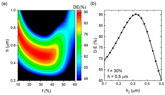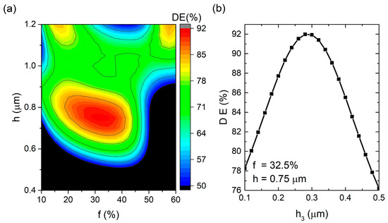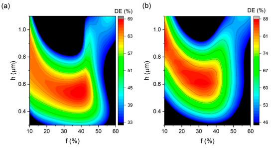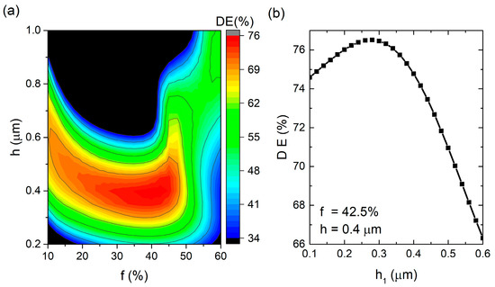 In the third case, we considered adding a layer of NOA as an ARC on a rectangular grating profile, as shown in Figure 1e. Figure 5a shows a contour plot of the calculated diffraction efficiencies as a function of groove depth and filling factor . Diffraction efficiencies larger than 90% can be achieved over the optimal ranges of and . The antireflective coating layer thickness was optimized numerically by varying coating thickness while keeping the optimum filling factor and optimum groove depth fixed at % and , respectively, as illustrated in Figure 5b. This resulted in a maximum diffraction efficiency of as high as 92%, with % and as the optimal parameters.