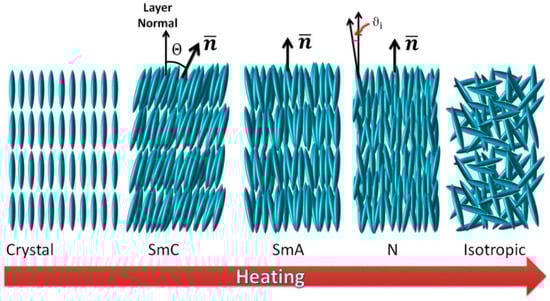 The molecular arrangement of crystal, liquid crystalline (SmC, SmA, and N) and isotropic phases. Reprinted/adapted with permission from Ref. [6]; published by MDPI AG, 2017.