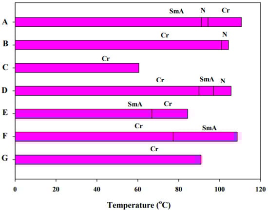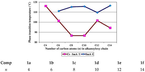 Phase transition temperatures of compound 1(a–f). Reprinted/adapted with permission from Ref. [25]; published by Elsevier, 2011.