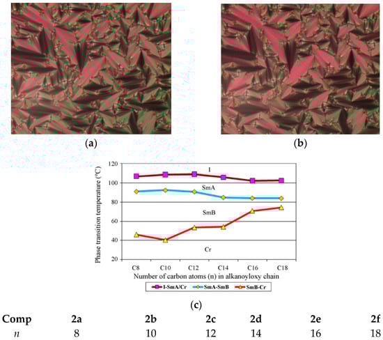 For enantiotropic materials, during heating and cooling processes, similar mesophases were observed. The homogeneous focal-conic texture of the smectic A phase after cooling compound 2a from isotropic liquid was first observed in Figure 4a, accompanied by temporary transition bars showing the transition phase from smectic A to smectic B phase, Figure 4b. Figure 4c displays a plot of phase transition temperatures against the number of carbon atoms (n) in the alkanoyloxy chain during the cooling scan. It can be deduced that the length of the terminal alkanoyloxy chains affected the mesomorphic properties based on the plot [31]. The phase shifted from enantiotropic to monotropic smectic phase B with the increasing length of the terminal chain. It is evident from the graph that the spectrum of mesophase increases from n-octanoyloxy to ndecanoyloxy members. Due to the rise in terminal alkanoyloxy chain length, this phenomenon has contributed to the improvement of smectic properties. However, owing to the dilution of the mesogenic core, the mesophase spectrum of n-dodecanoyloxy to n-octadecanoyloxy decreased [26]. The optimal exhibition (largest mesophase range) in both smectic phase A and smectic phase B was shown by n-decanoyloxy derivatives.