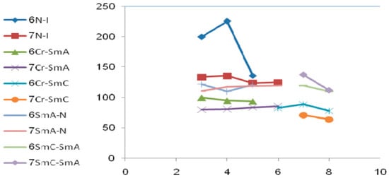 Overall, the length of the alkoxy chain influenced the mesogenic properties. Melting temperatures and clearing temperatures are lowered by increasing the number of carbon chains. As the molecule’s flexibility improved, the terminal attraction became smaller, leading to lower phase stability [37,38]. In general, compounds with long alkyl chain lengths displayed enantiotropic mesophase that is thermodynamically stable, whereas compounds with shorter alkyl chains showed monotropic mesophase as these compounds had unpredictable behaviour [39]. Consequently, compound 6a with a shorter alkyl chain was unable to cause the development of mesophase. Smectic phase formation may be due to the lamellar packing. The layered system broke down at the definite temperature and the magnitudes of the end-to-end side intermolecular attractions and the ideal permanent dipole moment were still preserved. This prompted the homologue to adopt a nematogenic character in parallel orientational order, either directly or by a smectic process in an enantiotropic fashion [40,41].