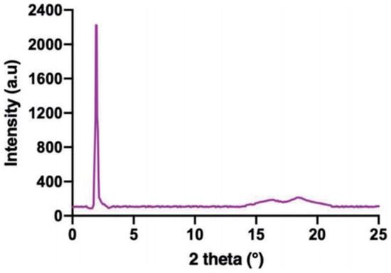 As a reference, compound c was used for further review. The XRD diffractogram of 5c can be seen in Figure 13. A single sharp peak at 2θ = 1.19° and a wide peak with a wide angle at 2θ = 15–21° were seen by the XRD diffractogram of compound 11c, showing that the molecules support the smectic layered structure. The compound that typically showed the smectic liquid crystalline phase showed a sharp and high low-angle peak (1° > 2θ > 4°) and a large peak in the XRD curve at 2θ ≈ 20° [42]. The sharp peak showed the standard spaced layer structure, while the disordered packing of alkyl chains had a broad peak. The estimated d/L was 1.11 (d ≈ L), equivalent to approximately 1. This phenomenon shows that monolayer structure is the SmA phase determined under POM. The side arms linked to the cyclotriphosphazene ring’s phosphorus atoms were arranged three up and three down. These side arms conform perpendicular to the cyclotriphosphazene ring as this form is appropriate for the smectic configuration due to the behaviour of homeotropic alignment.